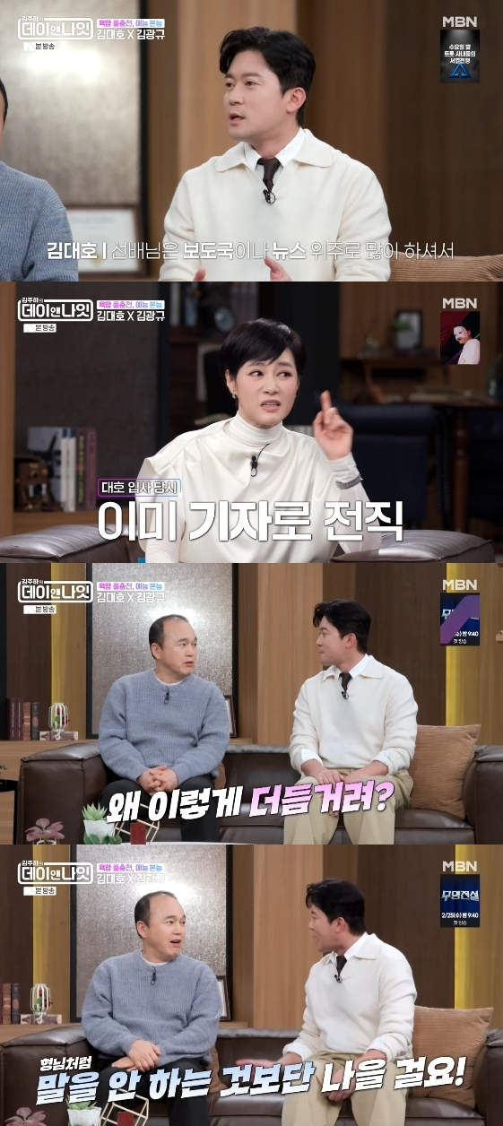21일 방송된 MBN 예능 프로그램 '김주하의 데이앤나잇'에는 오는 25일 첫 방송을 앞둔 예능 '무명전설'의 주역 김대호와 배우 김광규가 게스트로 출연했다.