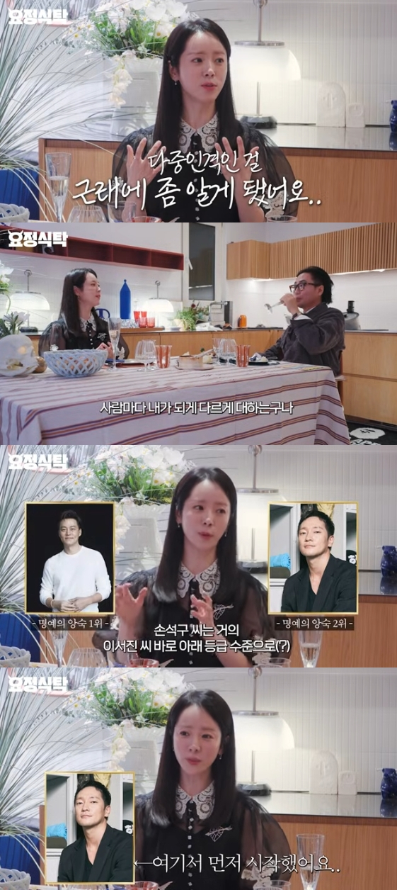 그는 "드라마 '우리들의 블루스'의 김우빈 씨나 그 배우들이 만나서 저에 대해 얘기를 나누면 한 사람에 대해서 얘기 나누는 것 같지 않겠다 싶었다. 제가 남주혁 씨한테 하는 거랑 수호 씨한테 하는 거랑 다르더라. 손석구 씨는 거의 이서진 씨 바로 아래 등급 수준이다"라고 말해 현장을 폭소케 했다.