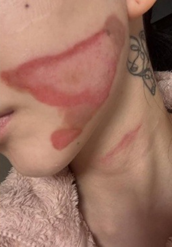 그는 이와 함께 피부 시술 중 화상을 입은 얼굴을 치료한 사진을 공개했다. 그는 한쪽 볼 전체에 거즈를 붙인 모습이었다.