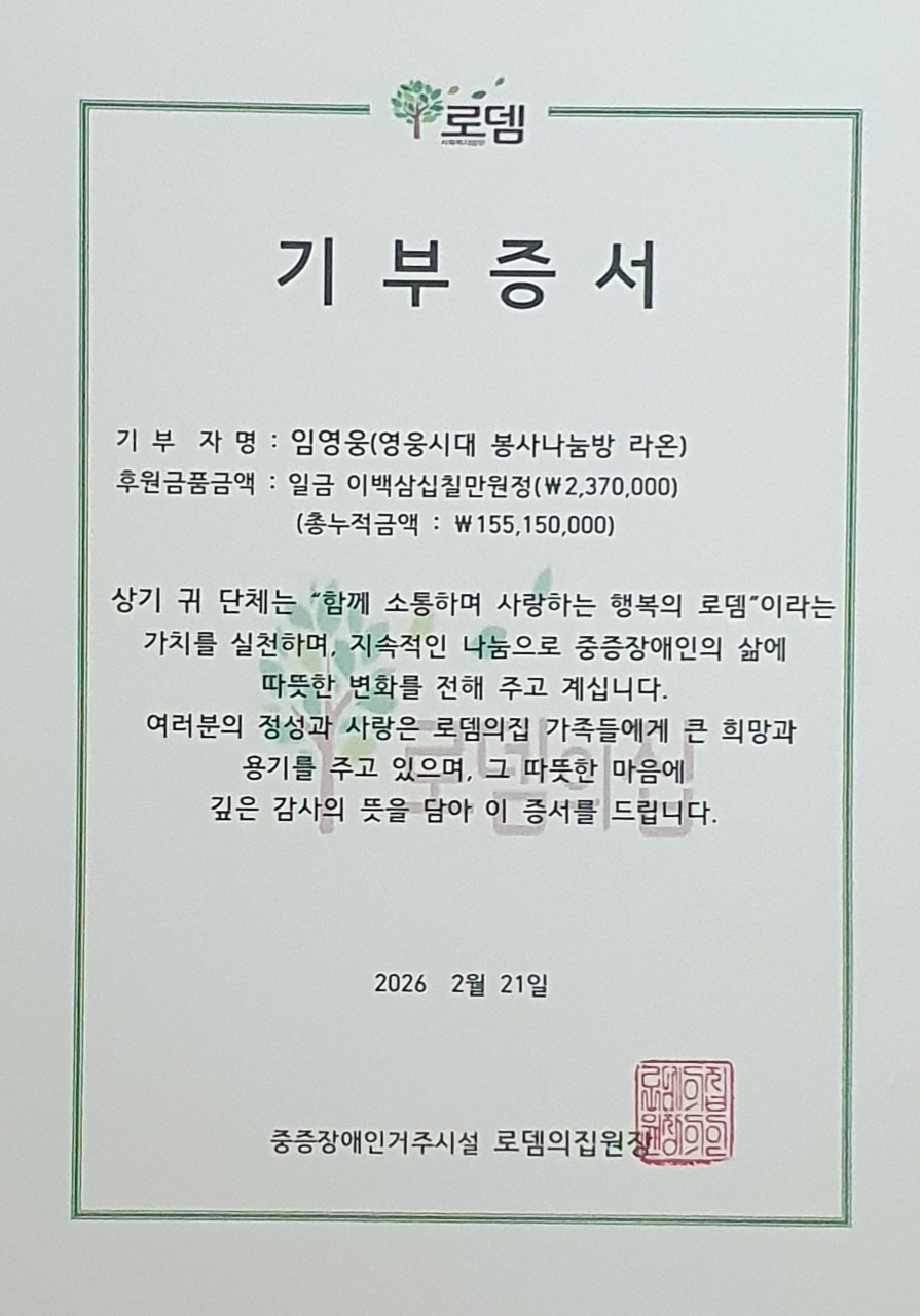 가수 임영웅의 팬들이 설을 맞아 따뜻한 나눔을 실천했다. 임영웅 팬클럽 영웅시대 봉사나눔방 '라온'은 지난 2월 21일 양평 로뎀의집에서 56번째 급식 봉사와 237만 원의 기부를 진행했다.