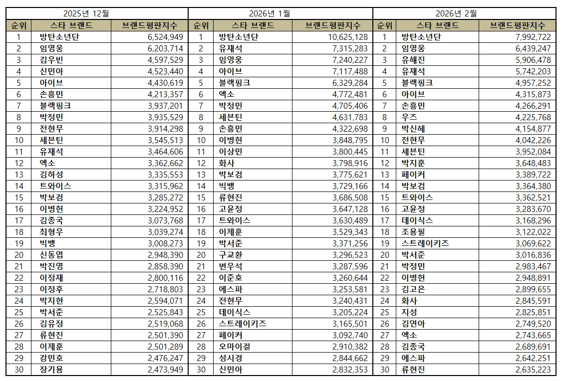 2026년 2월 스타 브랜드평판 30위 순위는 방탄소년단, 임영웅, 유해진, 유재석, 블랙핑크, 아이브, 손흥민, 우즈, 박신혜, 전현무, 세븐틴, 박지훈, 페이커, 박보검, 트와이스, 고윤정, 데이식스, 조용필, 스트레이키즈, 박서준, 박정민, 이병헌, 김고은, 화사, 지성, 김연아, 엑소, 김종국, 에스파, 류현진 순으로 분석됐다.