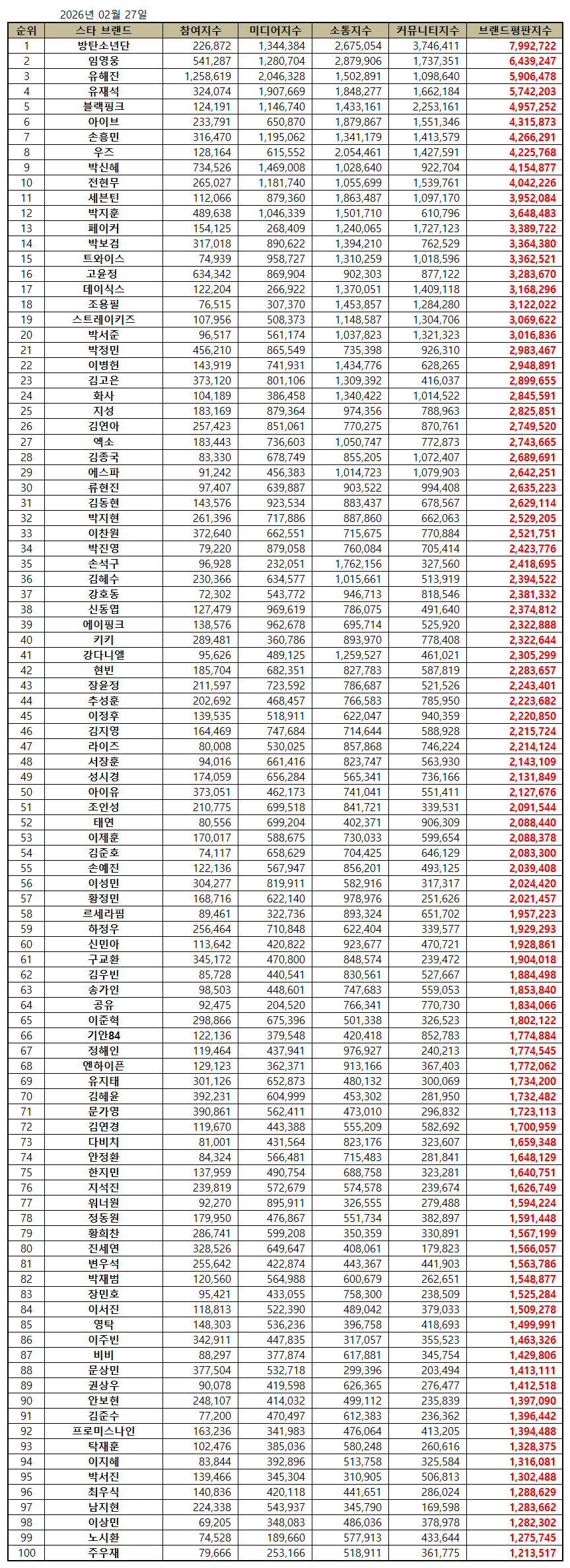이어서 "스타 브랜드 카테고리 2026년 2월 스타 브랜드 빅데이터를 분석해보니 지난 1월 스타 브랜드 빅데이터 279,006,497개와 비교하면 13.16% 줄어들었다. 세부 분석을 보면 브랜드소비 2.34% 상승, 브랜드이슈 6.31% 하락, 브랜드소통 14.49% 하락, 브랜드확산 20.49% 하락했다"라고 평판 분석했다.스타 브랜드평판 2026년 2월 빅데이터 분석 100위는 방탄소년단, 임영웅, 유해진, 유재석, 블랙핑크, 아이브, 손흥민, 우즈, 박신혜, 전현무, 세븐틴, 박지훈, 페이커, 박보검, 트와이스, 고윤정, 데이식스, 조용필, 스트레이키즈, 박서준, 박정민, 이병헌, 김고은, 화사, 지성, 김연아, 엑소, 김종국, 에스파, 류현진, 김동현, 박지현, 이찬원, 박진영, 손석구, 김혜수, 강호동, 신동엽, 에이핑크, 키키, 강다니엘, 현빈, 장윤정, 추성훈, 이정후, 김용빈, 라이즈, 서장훈, 성시경, 아이유, 조인성, 태연, 이제훈, 김준호, 손예진, 이성민, 황정민, 르세라핌, 하정우, 신민아, 구교환, 김우빈, 송가인, 공유, 이준혁, 기안84, 정해인, 엔하이픈, 유지태, 김혜윤, 문가영, 김연경, 다비치, 안정환, 한지민, 지석진, 워너원, 정동원, 황희찬, 진세연, 변우석, 박재범, 장민호, 이서진, 영탁, 이주빈, 비비, 문상민, 권상우, 안보현, 김준수, 프로미스나인, 탁재훈, 이지혜, 박서진, 최우식, 남지현, 이상민, 노시환, 주우재 순으로 분석됐다.