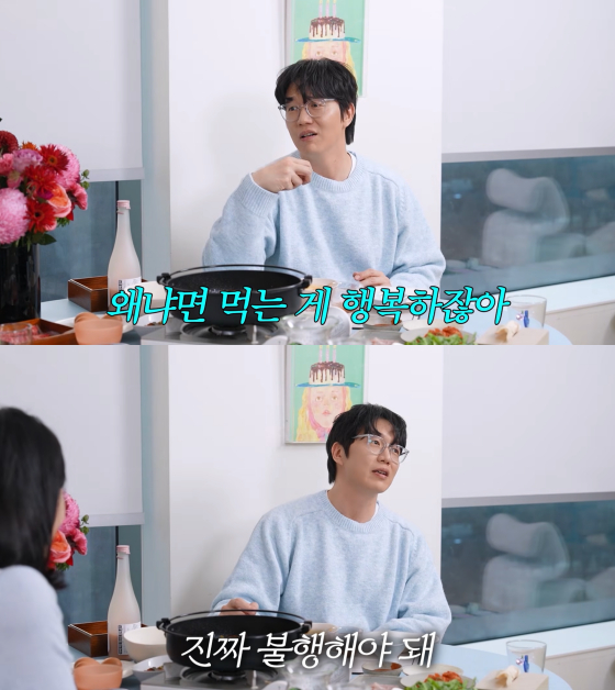 그러면서 "이건 내 명언이다. 우리가 왜 살이 쪘냐면 필요 이상으로 행복했기 때문이다. 그만 먹어도 되는데 낙이 없으니까. 빠지려면 진짜 불행해야 한다"고 너스레를 떨어 웃음을 자아냈다.