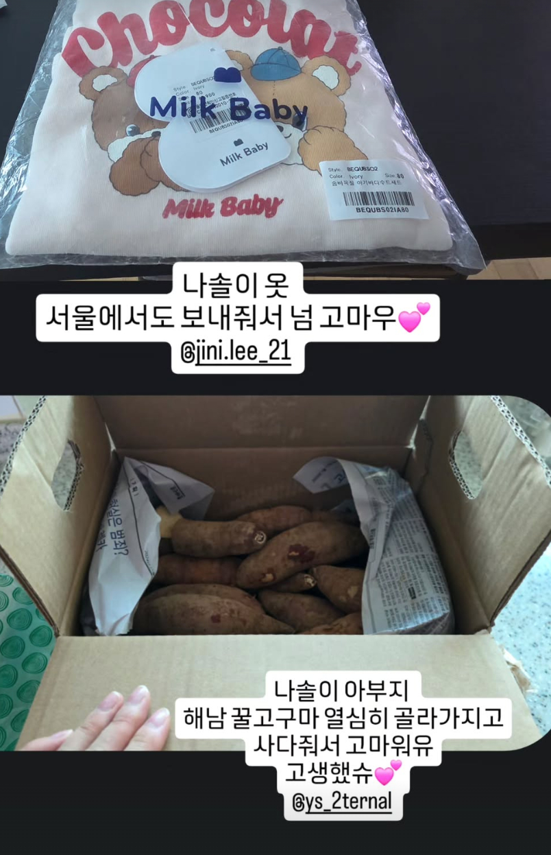 28기 정숙은 또한 나솔이 선물도 공개하고 "나솔이 옷 서울에서도 보내줘서 너무 고마워"라고 밝혔다. 이어 "나솔이 아버지 해남 꿀고구마 열심히 골라가지고 사다줘서 고마워유 고생했슈"라고 전했다.