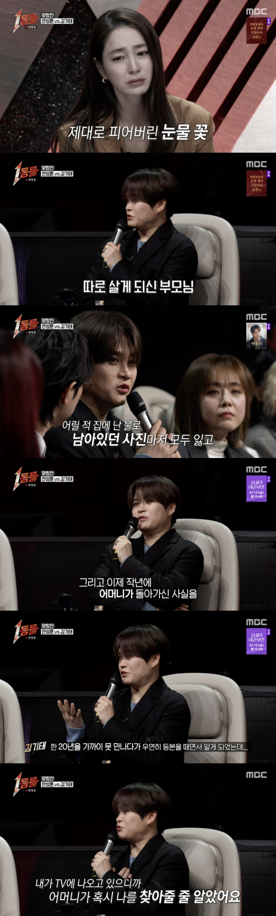 가수 김기태가 돌아가신 어머니를 떠올리다 울컥했다.15일 오후 방송된 MBC 예능 프로그램 '1등들'에서는 김기태가 김진호의 '가족사진'을 선곡하고 무대를 꾸몄다.