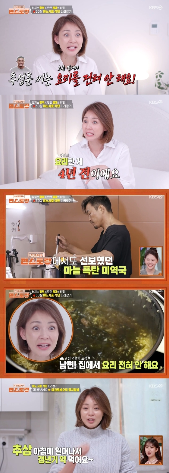 그는 '요섹남'으로 알려진 추성훈에 대해 "추상은 요즘 집에서 요리 전혀 안 한다. 요리한 게 4년 전이다. 4년 전 사랑이 생일날 끓여준 미역국이 마지막이었다"라고 밝혀 스튜디오를 술렁이게 했다.