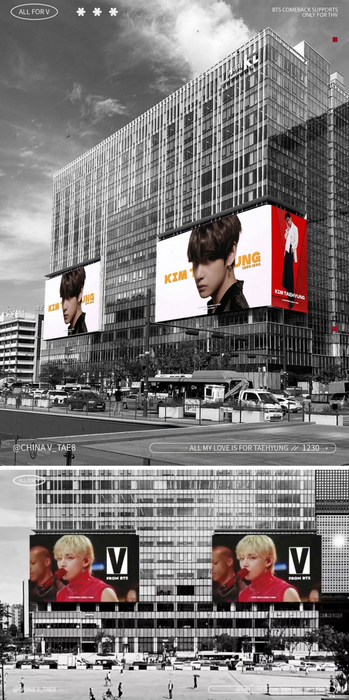 방탄소년단(BTS) 뷔의 컴백을 축하하는 국내외 팬들의 초대형 서포트가 화려하게 펼쳐지고 있다.뷔의 중국팬클럽 바이두뷔바는 광화문 KT 스퀘어의 더블 스크린에 뷔의 귀환을 알리는 축하 영상을 송출한다고 발표했다. 광화문 광장과 세종문화회관 인근에 위치한 KT 스퀘어는 서울 중심부의 랜드마크로, 크기 1770㎡로 5300평에 달하는 2면으로 구성된 더블 스크린이 위용을 자랑한다.