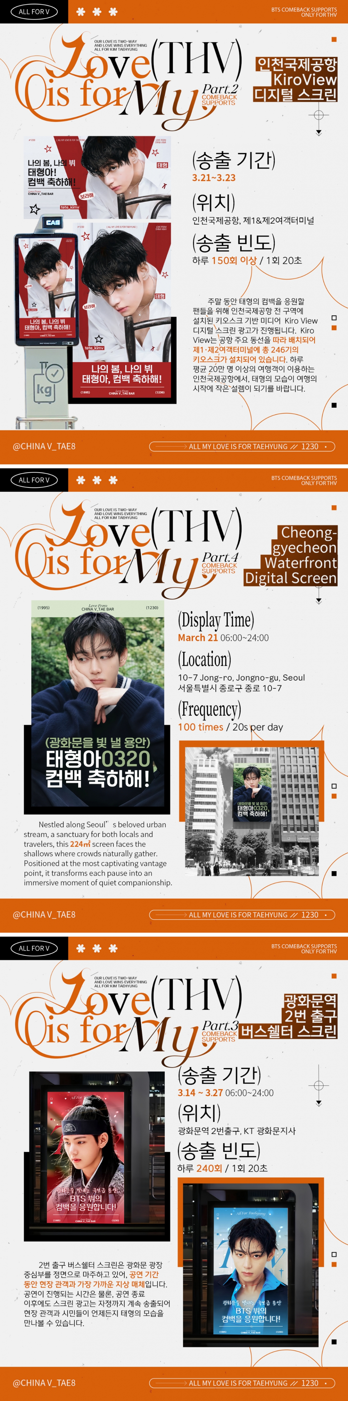 방탄소년단의 광화문 컴백공연을 맞아 협력한 끝에, KT가 지난 2월 11일 계약 가능한 전체 수량인 4개의 광고 구좌를 오픈해 즉시 4개의 광고구좌를 계약을 확정을 했다며, 광고 장소로 결정한 계기와 과정을 밝혔다. 뷔의 영상은 통상적으로 1일 최대 70회 광고송출 횟수의 2배인 140회가 송출된다. 중국팬클럽은 동아미디어센터에 개인의 광고로는 처음으로 뷔의 광고 서포트를 진행해 이목을 집중시킨 바 있다.인천국제공항에서는 246기의 키로뷰(Kiro View) 디지털 스크린에 뷔의 컴백 축하영상이 흘러나온다. 키로뷰는 출입국하는 여행객의 주요 동선을 따라 설치돼, 수많은 관광객들은 한국에 입국하는 순간부터 출국할 때까지 뷔의 영상이 노출된다.