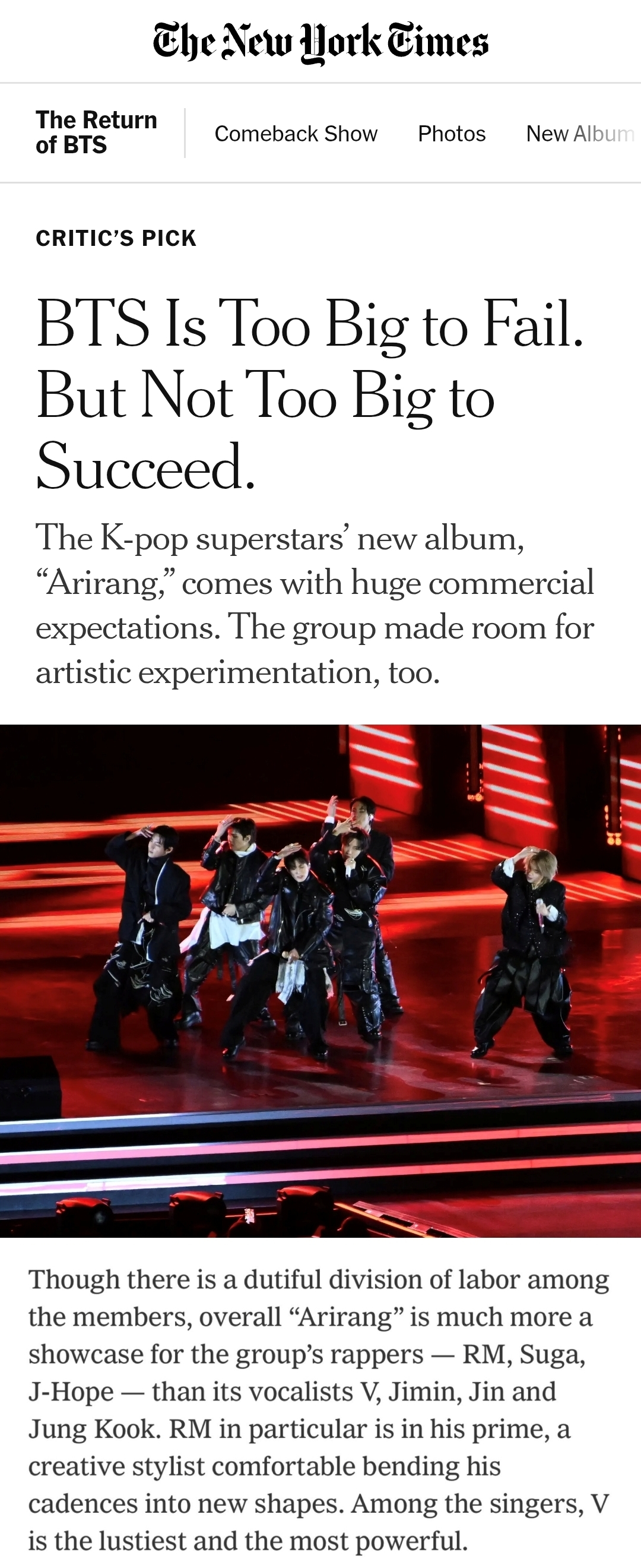 방탄소년단(BTS) 뷔가 미국 뉴욕 타임스로부터 뷔가 가장 열정적이고 파워풀한 보컬이라는 극찬을 받았다.방탄소년단은 지난 20일 다섯 번째 정규 앨범 '아리랑'(ARIRANG)을 발매했다. 이튿날인 21일에는 서울 광화문 광장에서 타이틀 곡 '스윔'(Swim)을 비롯한 신곡 무대를 최초로 공개했다. 넷플릭스에서 생중계된 'BTS 컴백 라이브: 아리랑'(BTS THE COMEBACK LIVE | ARIRANG)은 77개국에서 1위에 올랐다.