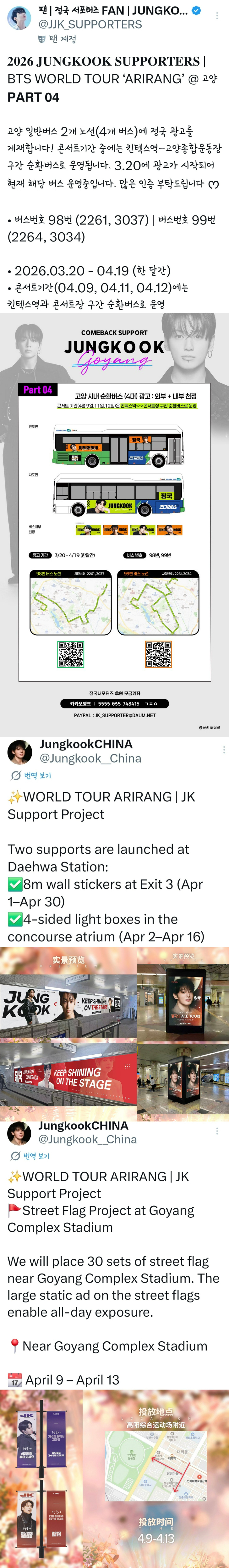 '정국 서포터즈'는 앞서 3월 21일 BTS 광화문 컴백 라이브 무대에서도 응원 서포트를 진행했다. KT 광화문빌딩 WEST KT 스퀘어와 청계한국빌딩 등지에 광고를 진행하고, 팬들에게 응원 부채 6000개와 매거진 20만 부를 배포했다. '정국 차이나' 역시 광화문 일대 전광판과 지하철 기둥 스크린을 활용해 정국 광고 송출 서포트를 펼쳤다.